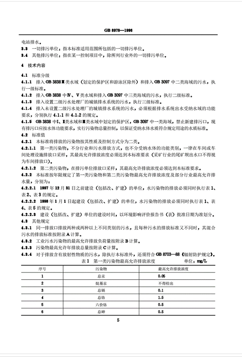 为贯彻《中华人民共和国环境保护法》、《中华人民共和国水污染防治法》和《中华人民共和国海洋环境保护法》,控制水污染,保护江河、湖泊、运河、渠道、水库和海洋等地面水以及地下水水质的良好状态,保障人体健康,维护生态平衡,促进国民经济和城乡建设的发展,特制定本标准。 本标准按照污水排放去向,分年限规定了69种水污染物最高允许排放浓度及部分行业最高允许排水量。